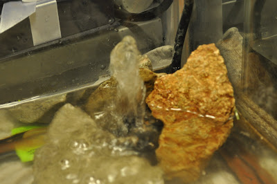 Then came the process of making it something that would suit him better than what we had before. First, I had to pile in rocks to get his heat rock up high enough that it wouldn't be IN the water. I also salvaged a small water pump from a table top fountain. The rubber hose had disintegrated so the pump was free for another use.